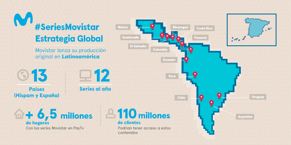Movistar Series ofrecerá series originales y una selección de producciones latinoamericanas de calidad a través de sus plataformas Movistar TV y Movistar Play. De esta manera, las series originales de Movistar+ llegarán a 12 países más. El nuevo canal estará disponible en Chile, Colombia y Perú desde el 15 de febrero y se sumará durante los próximos meses a la oferta de Movistar en Argentina, Costa Rica, Ecuador, El Salvador, Guatemala, México, Nicaragua, Panamá y Uruguay. El nuevo canal Movistar Series estrenará 12 serie originales a lo largo de 2018. Pero además de las series originales de Movistar+, el canal emitirá también contenidos en español producidos por terceros, series latinoamericanas de éxito en diferentes formatos de duración, así como películas y documentales. Cada semana, Movistar Series estrenará episodios de 9 series y 5 películas."En Latinoamérica vamos a convertirnos en una plataforma de plataformas, que ofrecerá los mejores contenidos del mercado, pero que también tendrá atributos diferenciales que hagan única nuestra propuesta de valor y la distingan por su calidad. Creemos que existe un enorme potencial para una plataforma de contenidos de calidad hechos en español y queremos que Movistar Series se convierta en el canal de referencia de estos contenidos", añade Michael Duncan.